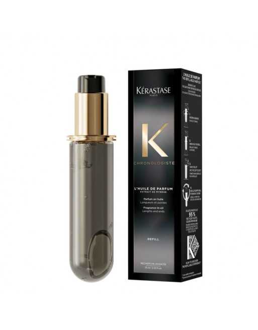 El Huile de Parfum Chronologiste recargable de Kérastase es un perfume en aceite capilar compuesto por una combinación excepcional de notas nobles de la perfumería fina: Rosa de Té, Maderas Ligeras y Almizcle. Delicadamente perfumado, el cabello se revitaliza, hidrata y engrosa con solo unas gotas.