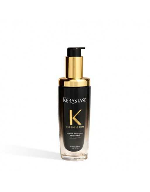 El Huile de Parfum Chronologiste recargable de Kérastase es un perfume en aceite capilar compuesto por una combinación excepcional de notas nobles de la perfumería fina: Rosa de Té, Maderas Ligeras y Almizcle. Delicadamente perfumado, el cabello se revitaliza, hidrata y engrosa con solo unas gotas.